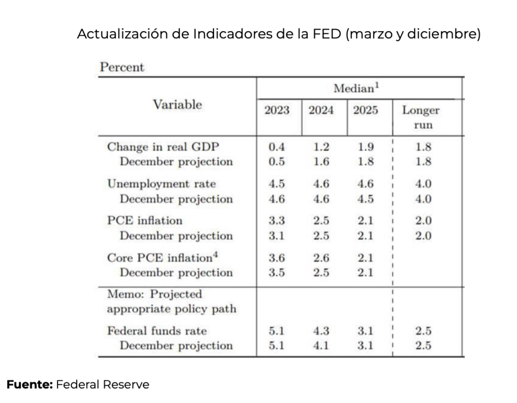 Como cada tres meses, la FED actualizó sus perspectivas referentes a la tasa de referencia, vislumbrando que podría concluir este año en 5.1%, sin cambios frente a la estimación de diciembre. Para 2024, la nueva estimación reflejó un ligero incremento a 4.3% desde 4.1%; sin embargo, se mantiene la expectativa de menores tasas en comparación con 2023 (5.1% vs. 4.3%). Por lo que se refiere al panorama económico, la nueva estimación sugiere que la economía podría crecer 0.4%, muy en línea con el pronóstico anterior de 0.5%. Para la inflación (Personal Consumption Expenditures, PCE), la nueva estimación refleja una ligera presión al alza considerando una tasa de 3.3% (vs. 3.1%).