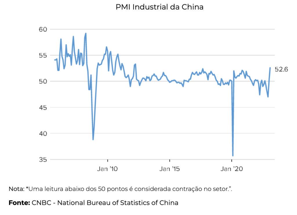 O relatório oficial da atividade industrial (PMI) da China referente ao mês de fevereiro mostrou forte crescimento e se manteve em terreno que indica expansão (+52,6p pontos*). Esse resultado foi melhor do que o esperado e representou a leitura mais alta desde abril de 2012.