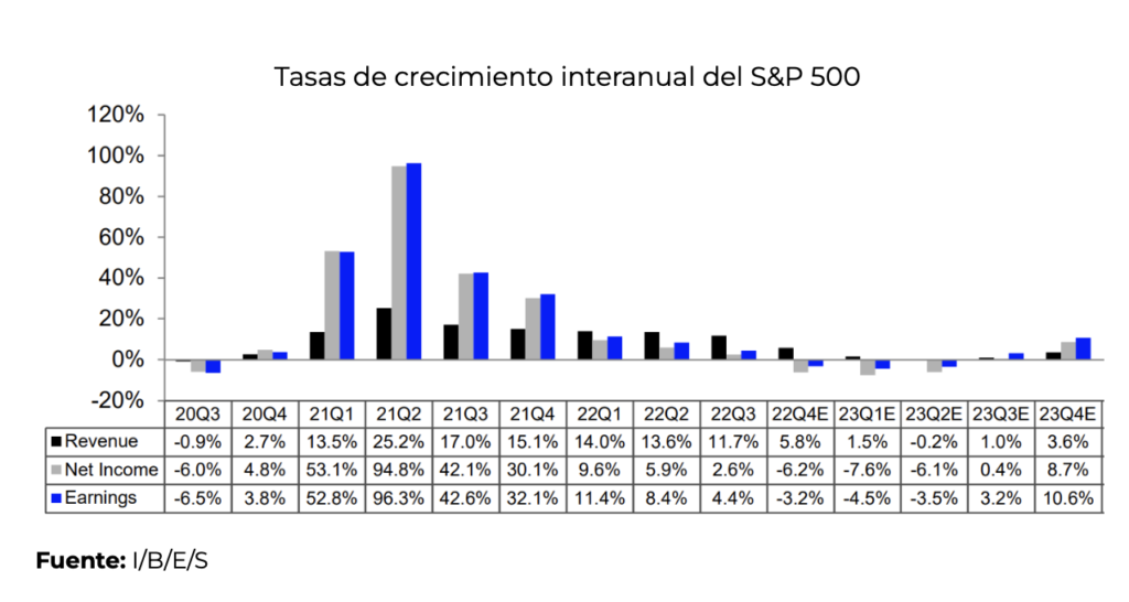 Por um lado, o comportamento do Lucro por Ação (LPA/EPS) foi sequencialmente muito mais fraco, já que no 3T22 foi observado um crescimento de 4,4% ano a ano (YoY), enquanto o valor final indica que, no 4T22, o EPS caiu 3% a/a (no início de janeiro, os analistas estimavam uma queda de 2% ao ano). Desde o 3T20, as empresas do S&P 500 não registram queda em seu LPA (-5,7% a/a). Por outro lado, 68% da amostra publicou um EPS que superou as expectativas de consenso, isso se compara à média de longo prazo de 66,3% e à média dos últimos quatro trimestres anteriores de 75,5%.