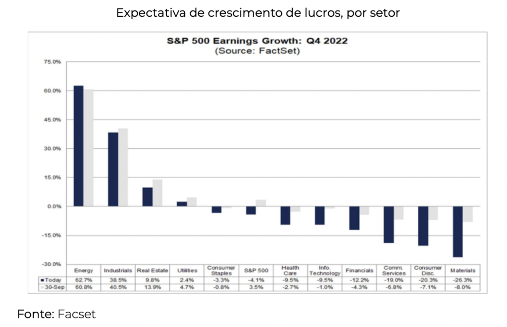 A temporada de balanços trimestrais do 4T22 está prestes a começar, fator que pode influenciar o humor dos mercados no curtíssimo prazo. Nesse sentido, os analistas estimam que as empresas do S&P 500 teriam diminuído seus lucros para 4,1% ao ano. Se confirmando esse número, será a primeira vez que o índice registra queda nos lucros desde o 3T20 (-5,7% a/a). No que diz respeito às receitas, as perspectivas apontam para um crescimento de 3,8% (a/a), o que representa um ajuste considerável em relação ao crescimento de 6,3% projetado no início do 4T22.