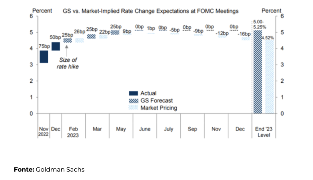Em seu primeiro comunicado do ano e em linha com as expectativas, o Fed aumentou a taxa de referência em 25pb para um intervalo entre 4,5-4,75% (a decisão foi unânime), o seu nível mais elevado desde outubro de 2007. Essa decisão representou um movimento menor face ao avanço de 50pb em dezembro passado e aos quatro aumentos de 75pb implementados ao longo de 2022.