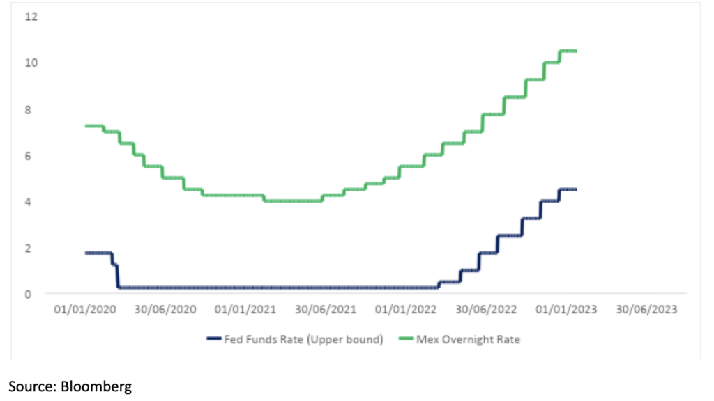 1. Interest rate differentials: Banxico began raising the reference rate in June 2021 to cushion the impact of the Fed’s rate hike. After a 650 bps (6.5 pp) rise, it is expected that Banxico is close to the end of the hiking cycle. However, the rate differential is expected to hold.